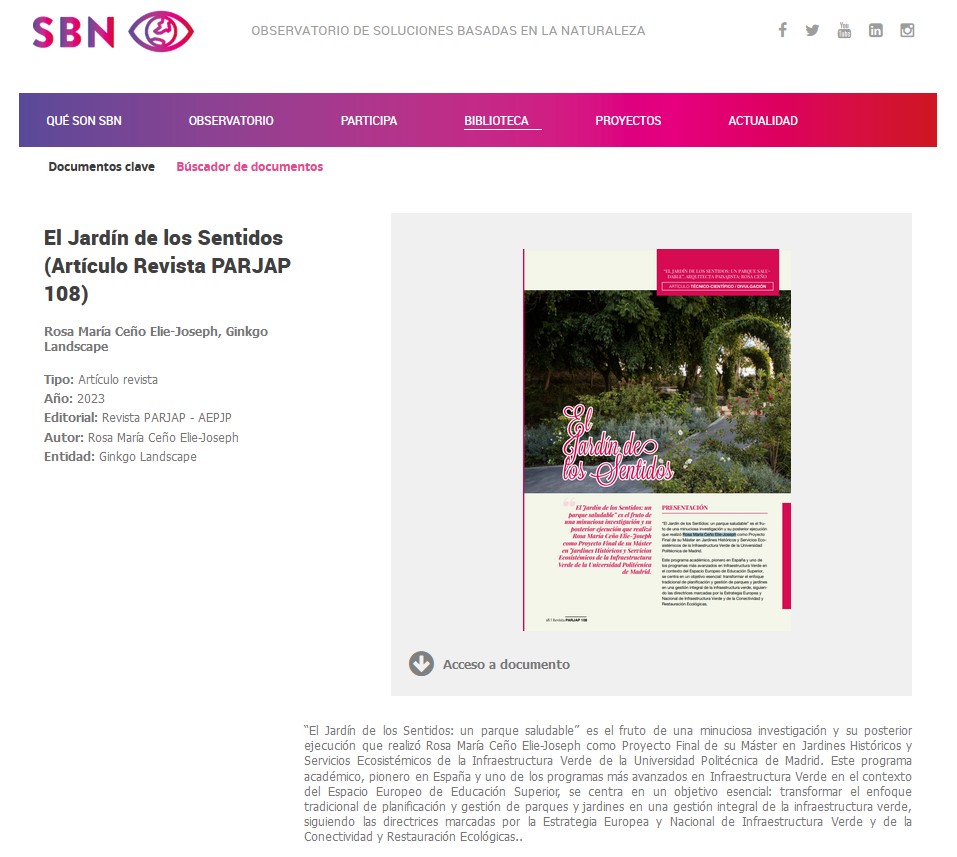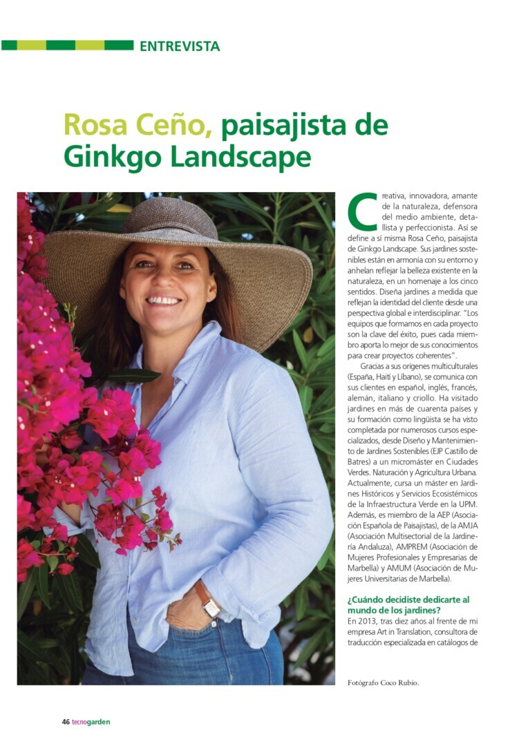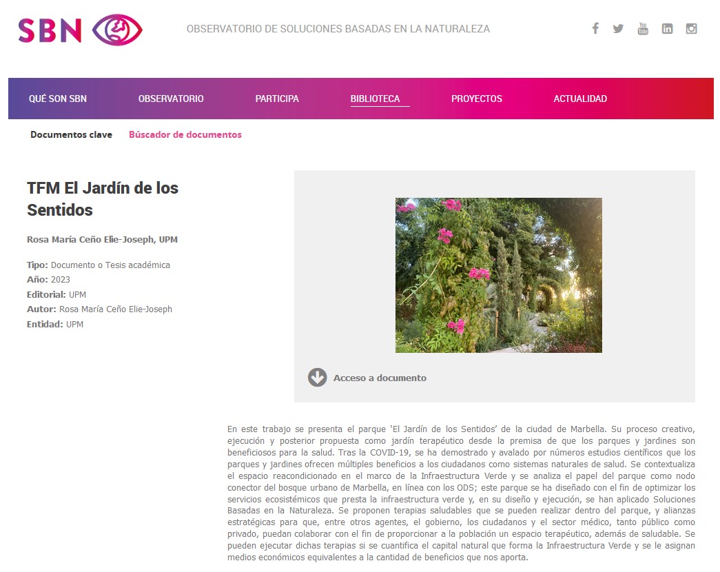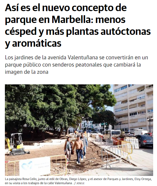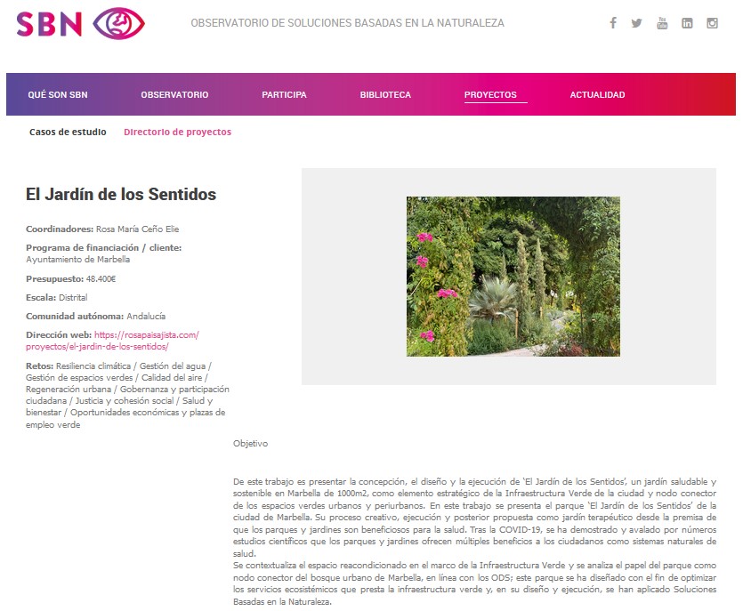 Diseño de espacios verdes con bajo consumo de agua. La ciudad ante el cambio climático. Gestión del agua en la ciudad. Diputación de Cádiz, COITAND, AMJA e IFAPA, junio 2024 Los Jardines de Rosa Ceño Los Jardines de Rosa Ceño Los Jardines de Rosa Ceño Los Jardines de Rosa Ceño Sequía y Soluciones basadas en la Naturaleza El Jardín de los Sentidos ¿Qué son los Servicios Ecosistémicos? Ciudades Verdes: Servicios Ecosistémicos e Infraestructura Verde, Conferencia AMUM, enero 2022 Los Jardines Sostenibles de Rosa Ceño, RTV Marbella, octubre 2021